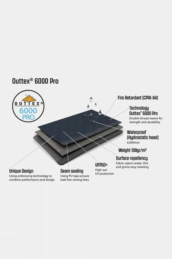 - Flysheet: Outtex 6000 Pro, 100% polyester