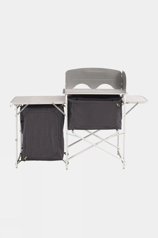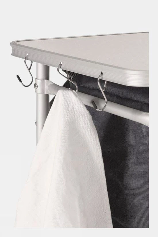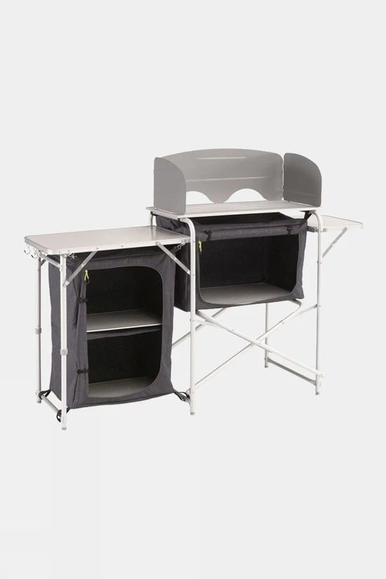 Easy to use, lightweight aluminium kitchen unit offering excellent cupboard and workspace required by a family for storage and food preparation, in a compact package for convenient transportation.